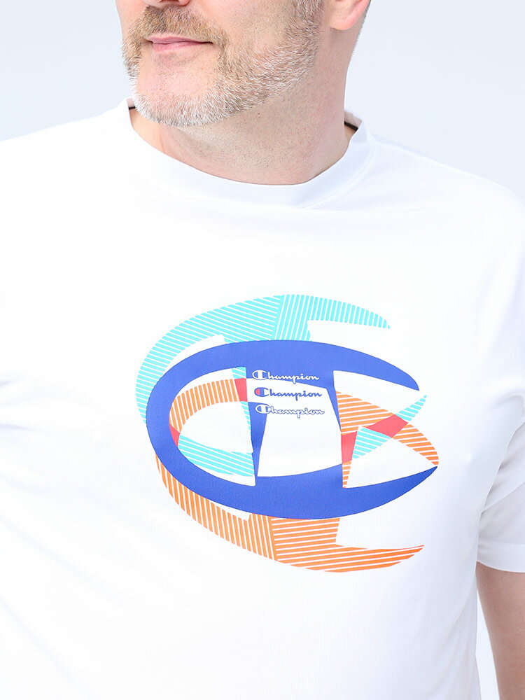 速乾と防臭機能が付いたChampionのスリーロゴプリント クルーネック 半袖 Tシャツです。