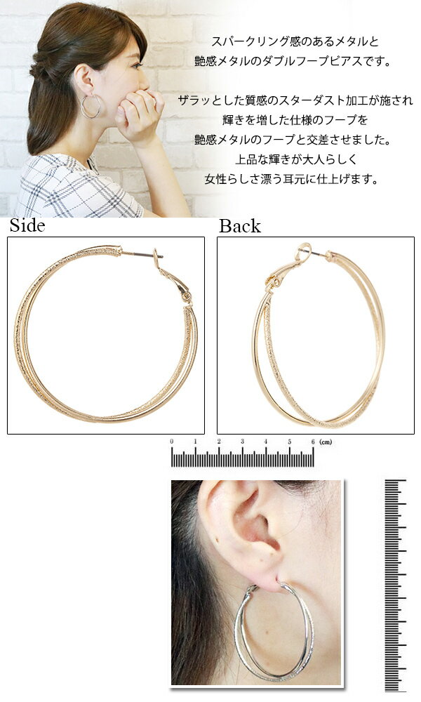 ギフト対応 素材: 真鍮製 プラチナロジウム/ゴールド/コーティング フープピアス チタン製ポスト サイズ: 直径:約4.5cm フープの太さ:それぞれ約1.7mm ポスト長さ/太さ:約10mm/0.7mm スパークリング感のあるつや消しメタルと 艶感メタルのダブルフープピアスです。