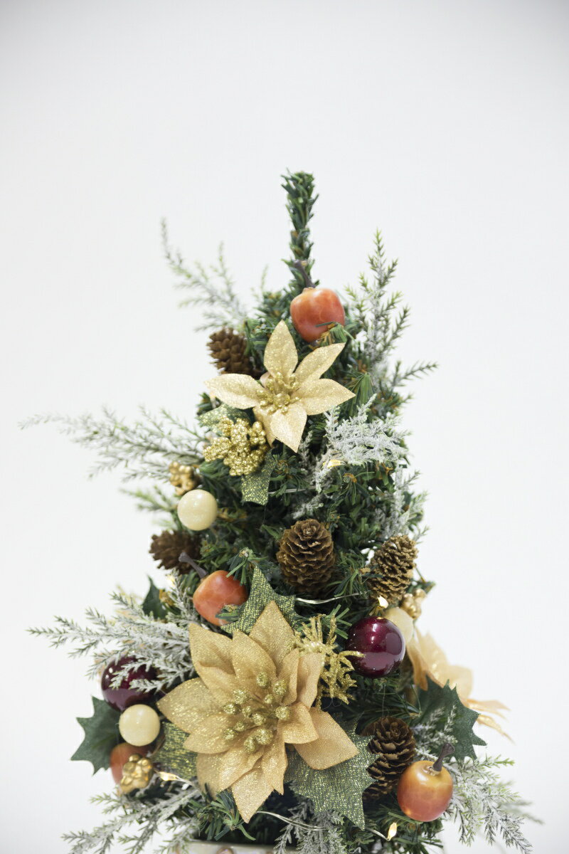 ウォームホワイトのLEDライトを巻き付けておりますので点灯していただくと温かみのあるロマンチックな空間に…(ライトは常時点灯します) ポットツリーを飾るだけで年に一度の聖なる夜が華やぎます。