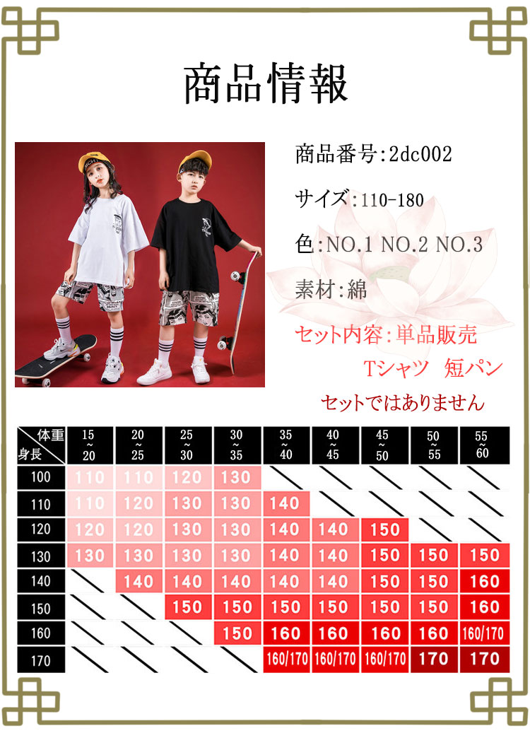 商品名: キッズダンス衣装 単品販売 半袖Tシャツ(白又は黒) 短パン(1種類) 素材 カラー サイズ 綿100% (NO.1 NO.2 NO.3) サイズ:110 120 130 140 150 160 170 180 生地の厚さ 透け感 伸縮性 普通 - ややあり 生産国 セット内容 CHINA セット内容:単品販売 Tシャツ 短パン セットではありません。
